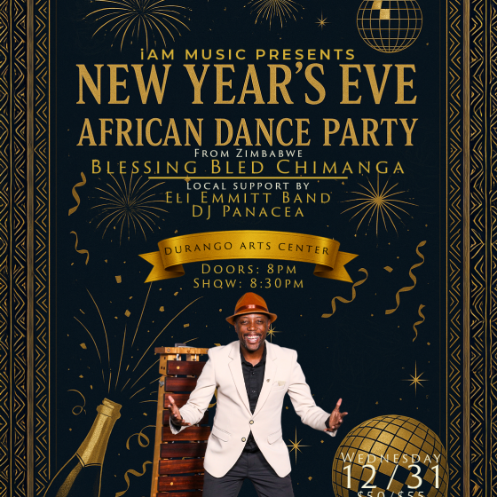 Ring in 2026 with an electrifying night of rhythm, song, and celebration at the Durango Arts Center. Zimbabwean percussionist, vocalist, and bandleader Blessing Bled Chimanga headlines an unforgettable New Year’s Eve, with soulful support from the Eli Emmitt Band and late-night grooves by DJ Panacea. Dress to shine, bring your friends, and dance your way into the new year!