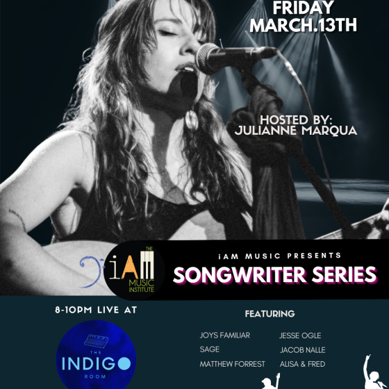 Join us for our Songwriters Series on Friday, March 13th Located at The iNDIGO Room inside the iAM MUSIC Institute, this free event, hosted by Julianne Marqua, will feature some amazing local musicians.